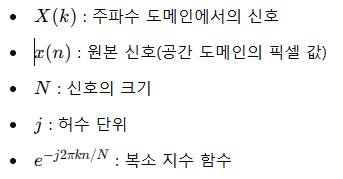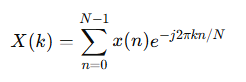 이산 푸리에 변환(DFT, Discrete Fourier Transform)은 다음과 같은 수식으로 정의됩니다.